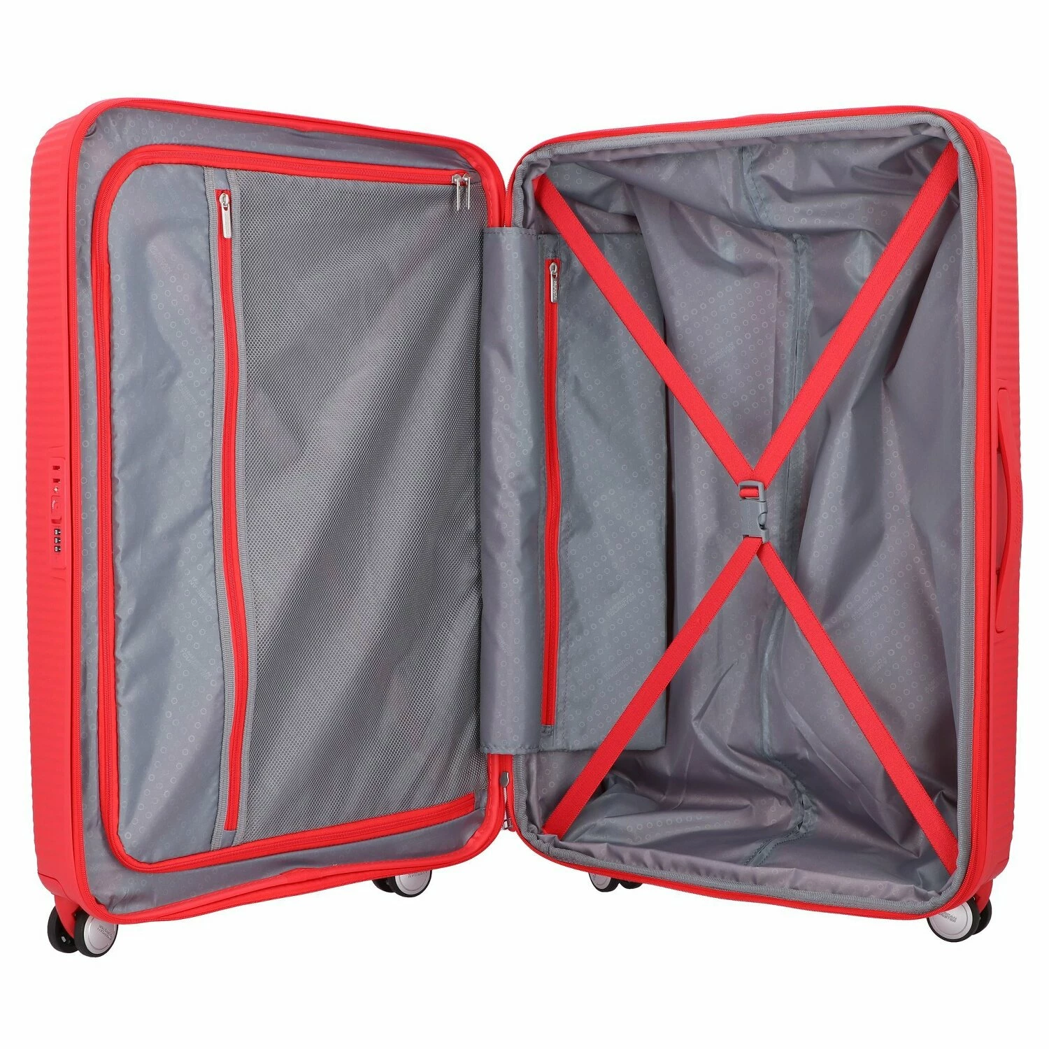 Robusto trolley de American Tourister de la serie Soundbox fabricado en polipropileno resistente. El amplio compartimento principal ofrece mucho espacio y cuenta con un divisor, un bolsillo de malla y una correa cruzada para una organización óptima, y está protegido con una cerradura TSA. El asa con cerradura y las cuatro ruedas de marcha suave hacen de este trolley el compañero de viaje perfecto.