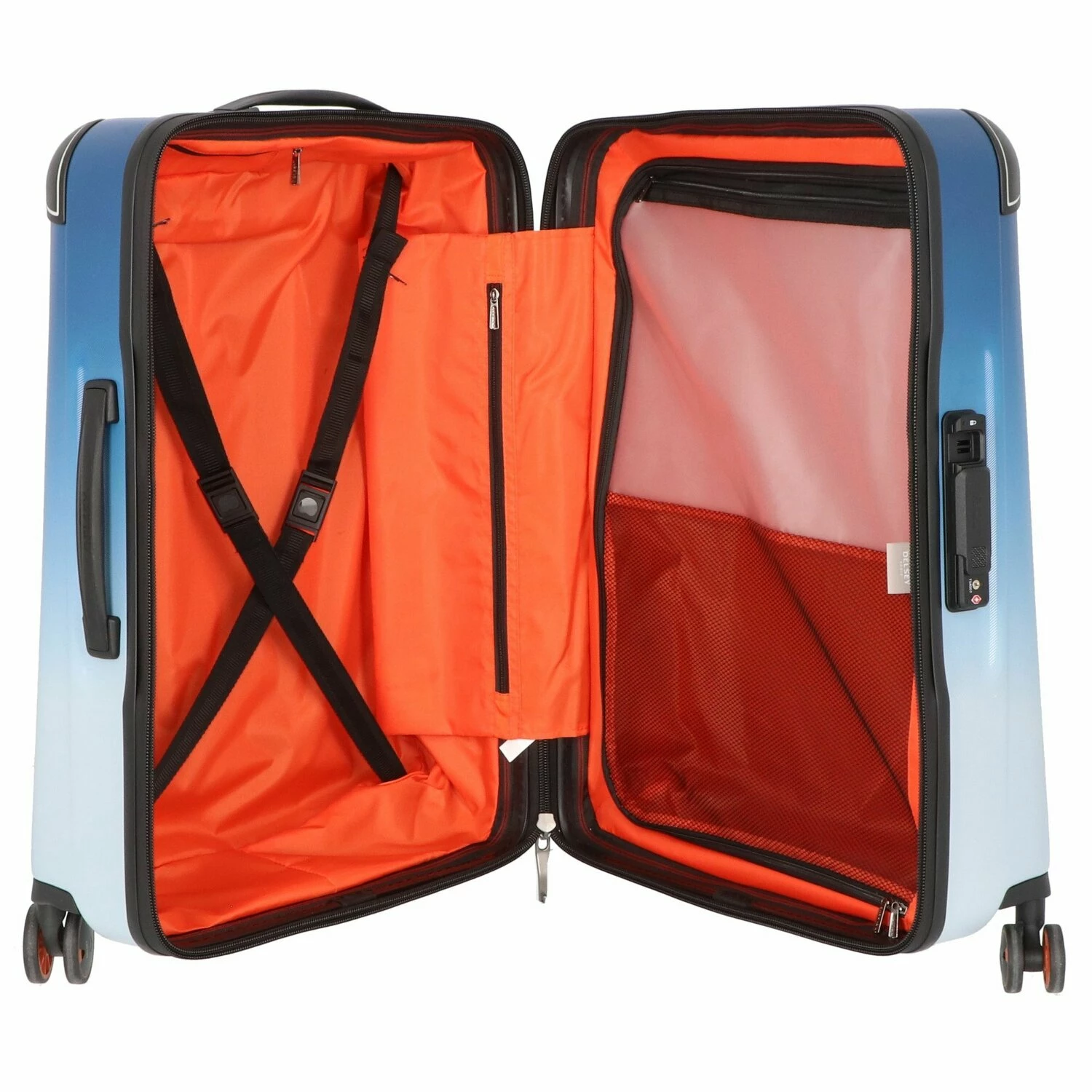Trolley de la marca Delsey fabricado en policarbonato resistente con cuatro ruedas dobles fáciles de manejar y silenciosas. El espacioso compartimento principal, con una cuidada distribución interior y un forro extraíble y lavable, ofrece mucho espacio, mientras que la correa de empaquetado cruzada en el interior mantiene la ropa y otros artículos firmemente en su sitio. Con una cerradura TSA y un sistema patentado de cierre ultraseguro, este trolley ofrece la máxima seguridad y el mínimo riesgo de robo al abrir la cremallera.