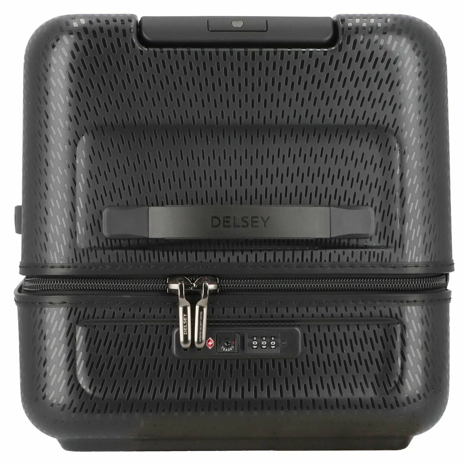 Elegante y práctico trolley de Delsey fabricado con material resistente. El compartimento principal está dividido y tiene un compartimento para la ropa sucia y varios compartimentos de malla o con cremallera. Una correa de embalaje cruzada garantiza que el equipaje se mantenga en su sitio en el carro durante el viaje. El carro tiene una cerradura TSA y 4 ruedas dobles silenciosas que giran 360°.