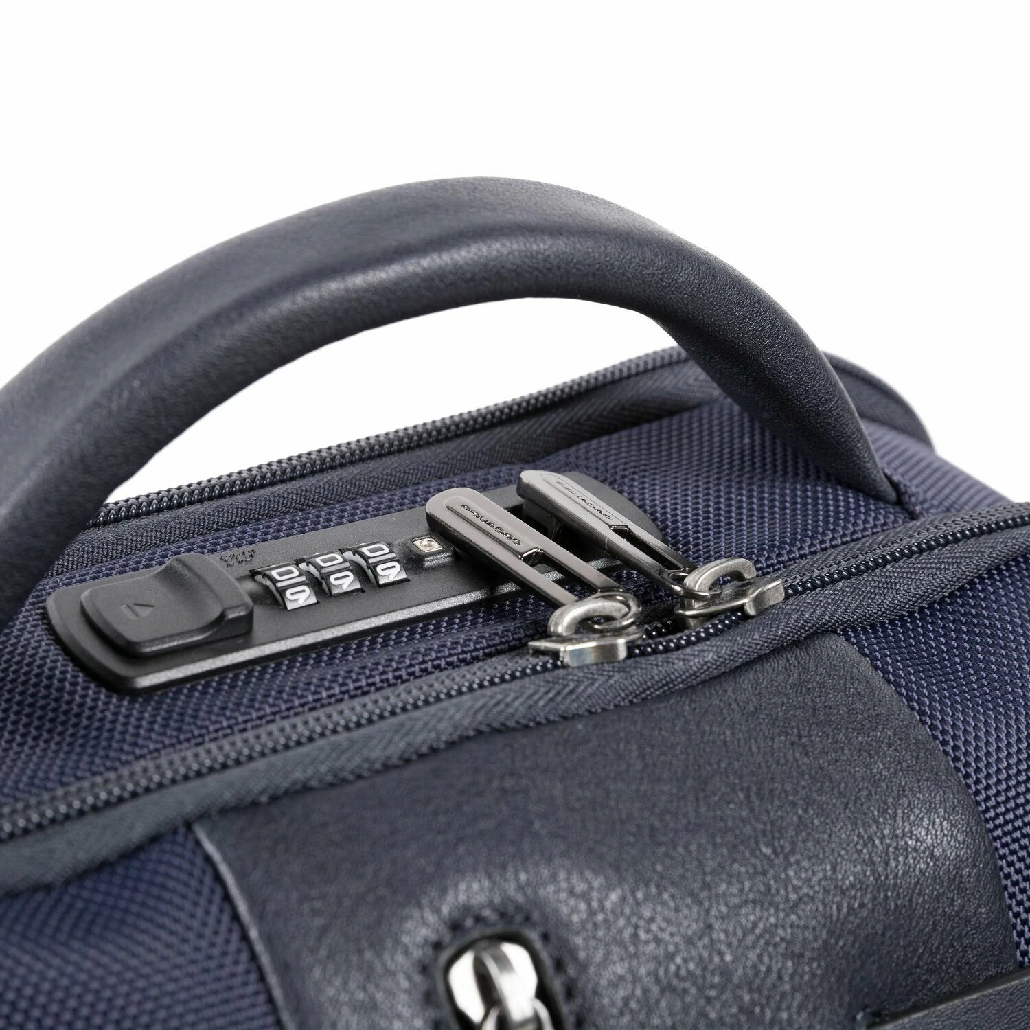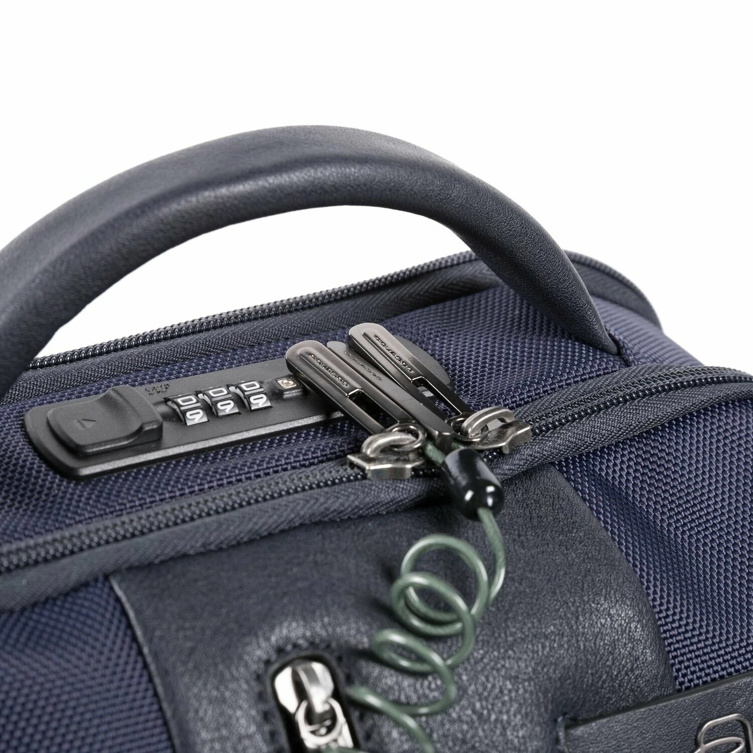 Mochila Fastcheck de la serie Brief de Piquadro fabricada en nailon reciclado y resistente. La mochila impresiona por su confección de alta calidad y su elegante interior. El compartimento principal tiene capacidad para documentos A4 y ofrece espacio suficiente para todo lo que necesitas para tu trabajo diario, mientras que el compartimento lateral está equipado con un compartimento acolchado para el portátil y un compartimento para la tableta. Otros elementos destacados son los bolsillos para bolígrafos, un portagafas, un bolsillo lateral para botellas o paraguas, un puerto USB integrado para facilitar la carga sobre la marcha, un compartimento secreto con protección RFID contra el robo de datos y un cable antirrobo con cierre de combinación para mayor seguridad. Un sistema de transporte acolchado y la función de enganche de trolley en la parte posterior completan el diseño.