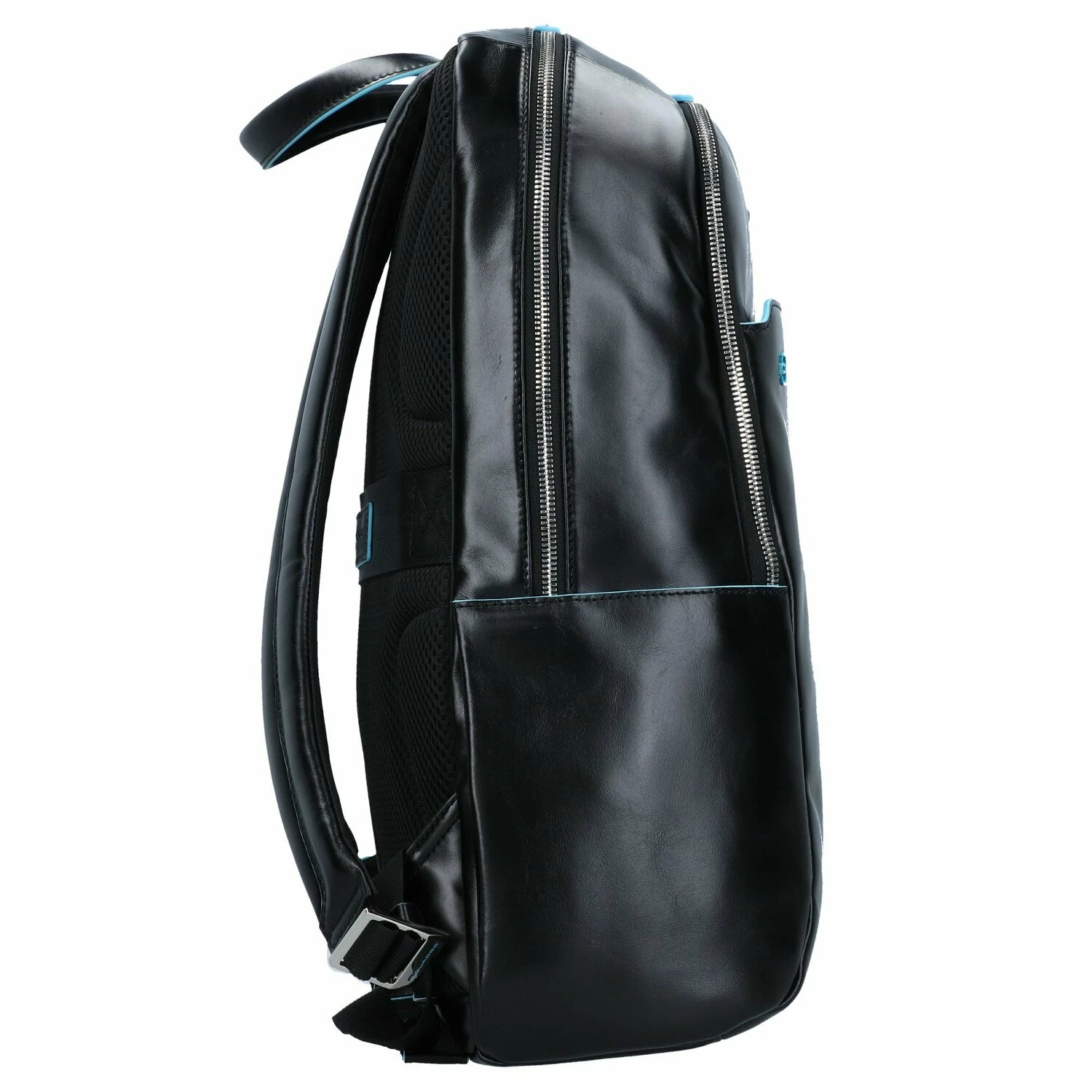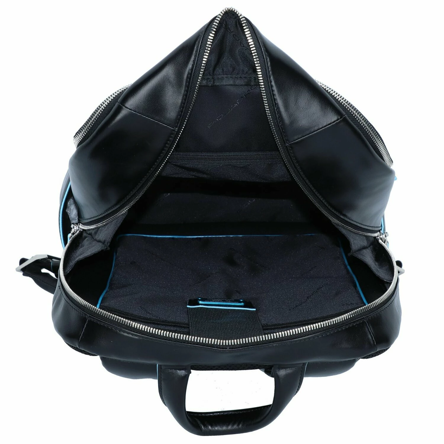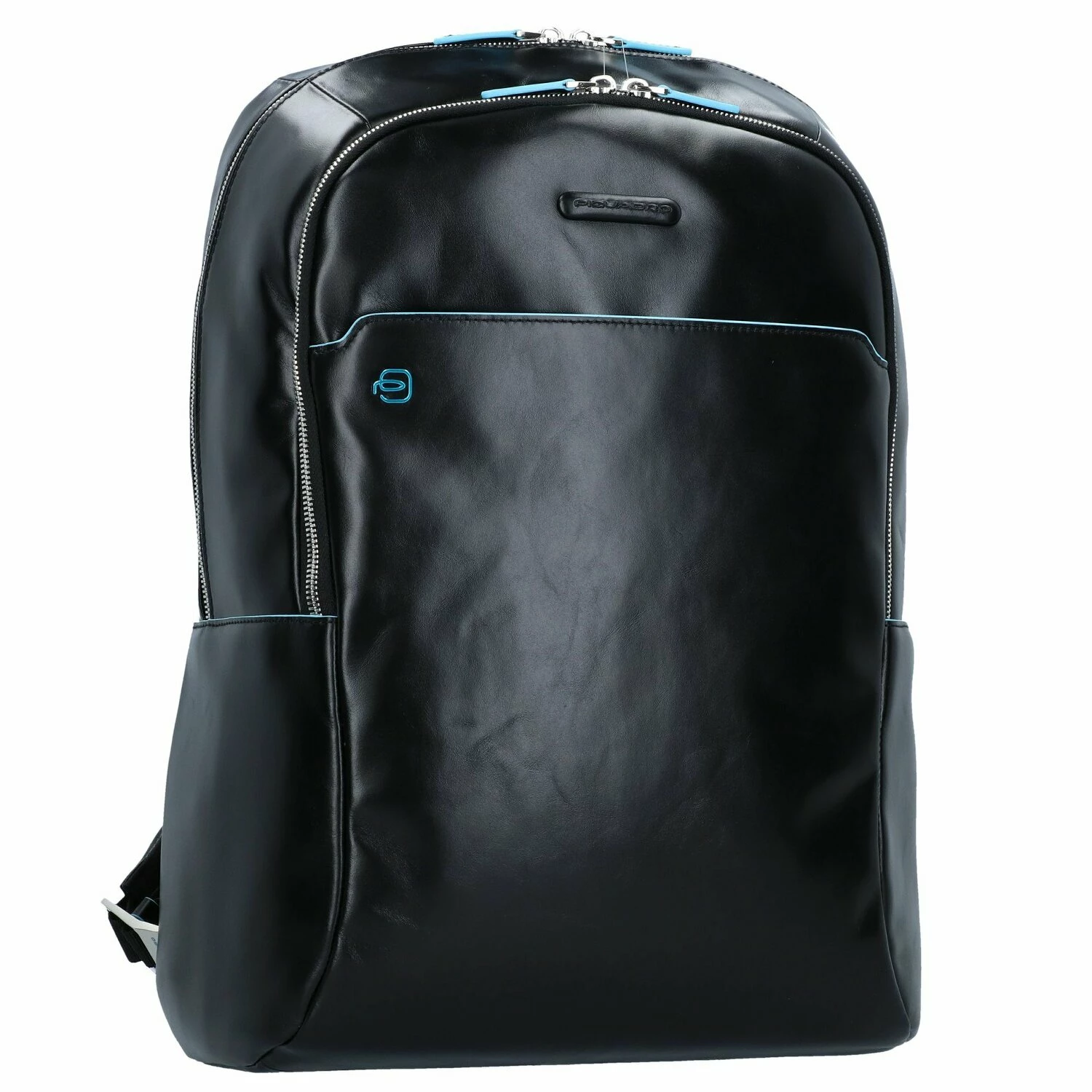 Mochila de la serie Blue Square de Piquadro fabricada en piel suave de alta calidad. La mochila tiene dos compartimentos principales, uno de los cuales se utiliza como compartimento para el portátil y la tableta. El interior está equipado con un compartimento con cremallera con protección RFID, dos bolsillos abiertos y dos bolsillos para bolígrafos.