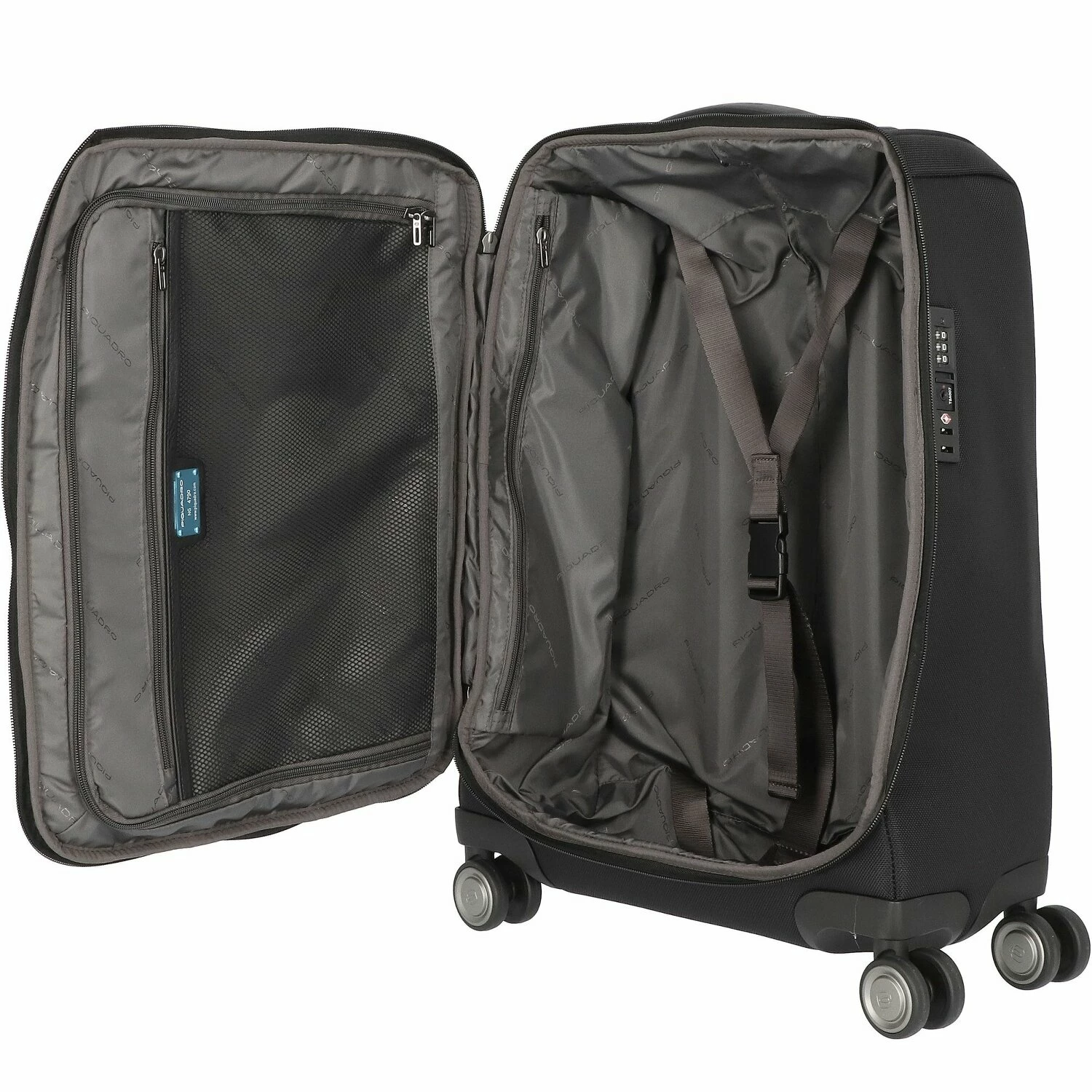 Lujoso trolley de cabina de Piquadro fabricado en nailon reciclado y resistente con un diseño moderno y minimalista. Con cuatro robustas ruedas dobles, asa telescópica bloqueable, correas de embalaje en el interior y numerosos compartimentos. El trolley ofrece mucho espacio de almacenamiento y es el compañero ideal en los viajes de negocios.