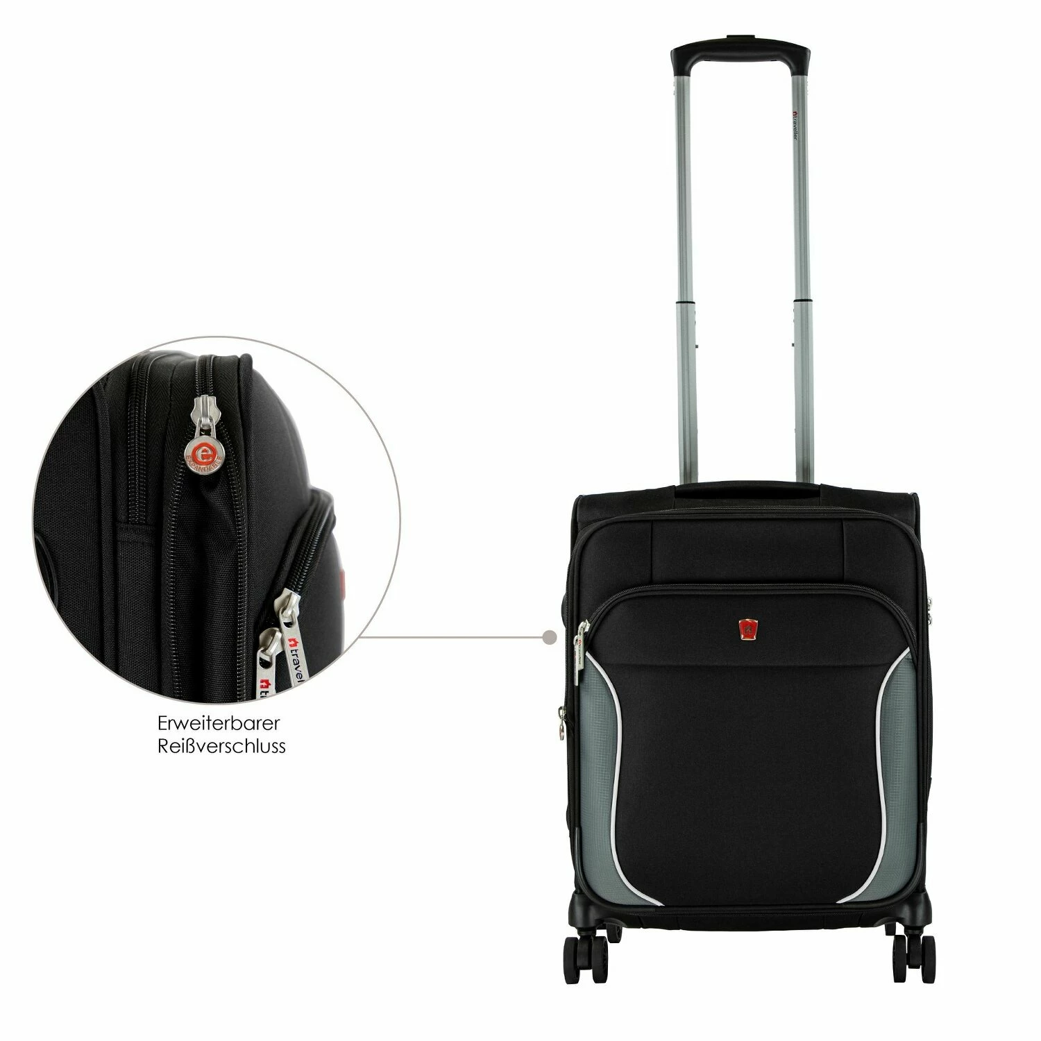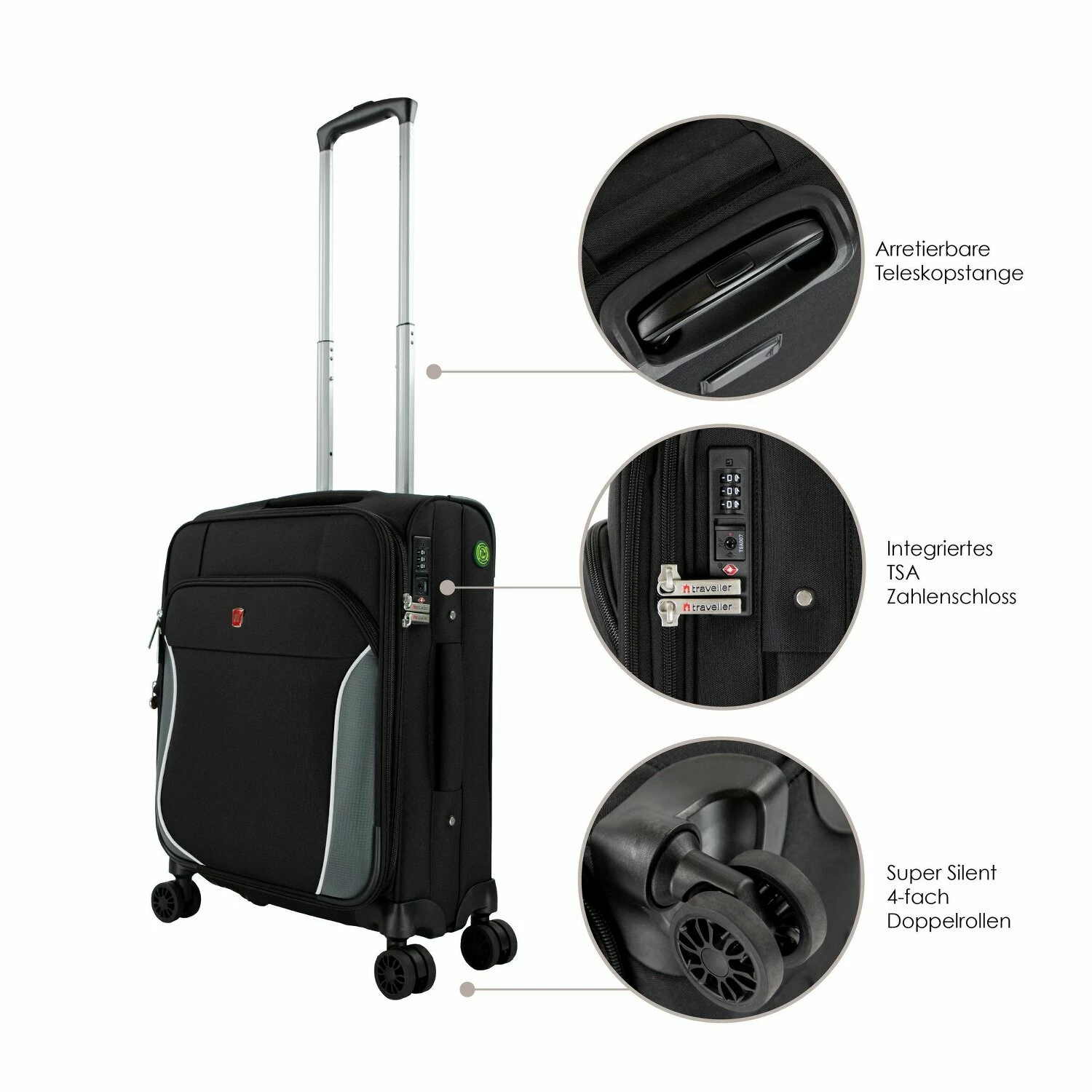 Trolley funcional y elegante de la marca Traveller con pliegue de expansión. El trolley tiene un compartimento principal con compartimentos con cremallera y correas de embalaje en el interior para que pueda guardarse de forma ordenada y clara. Los compartimentos de la parte delantera ofrecen espacio de almacenamiento adicional. Una cerradura TSA, un asa de transporte y 4 ruedas de marcha suave completan armoniosamente la funcionalidad del trolley. Su nuevo compañero en su próximo viaje.