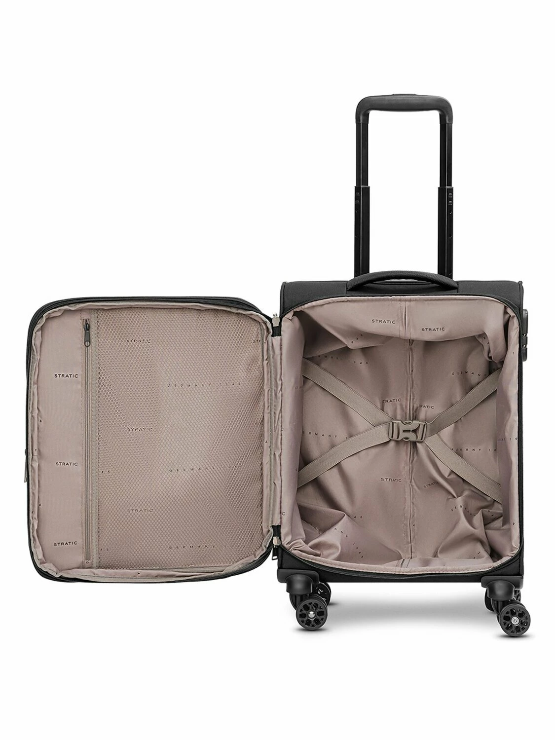 Cómodo trolley de cabina con 4 ruedas de Stratic fabricado en poliéster resistente. El trolley ofrece espacio suficiente para su equipaje y tiene una cerradura de combinación integrada para mayor seguridad. El volumen de la maleta puede ampliarse mediante el pliegue de expansión. El asa se puede ajustar cómodamente. Con este trolley estará perfectamente preparado para su próximo viaje.