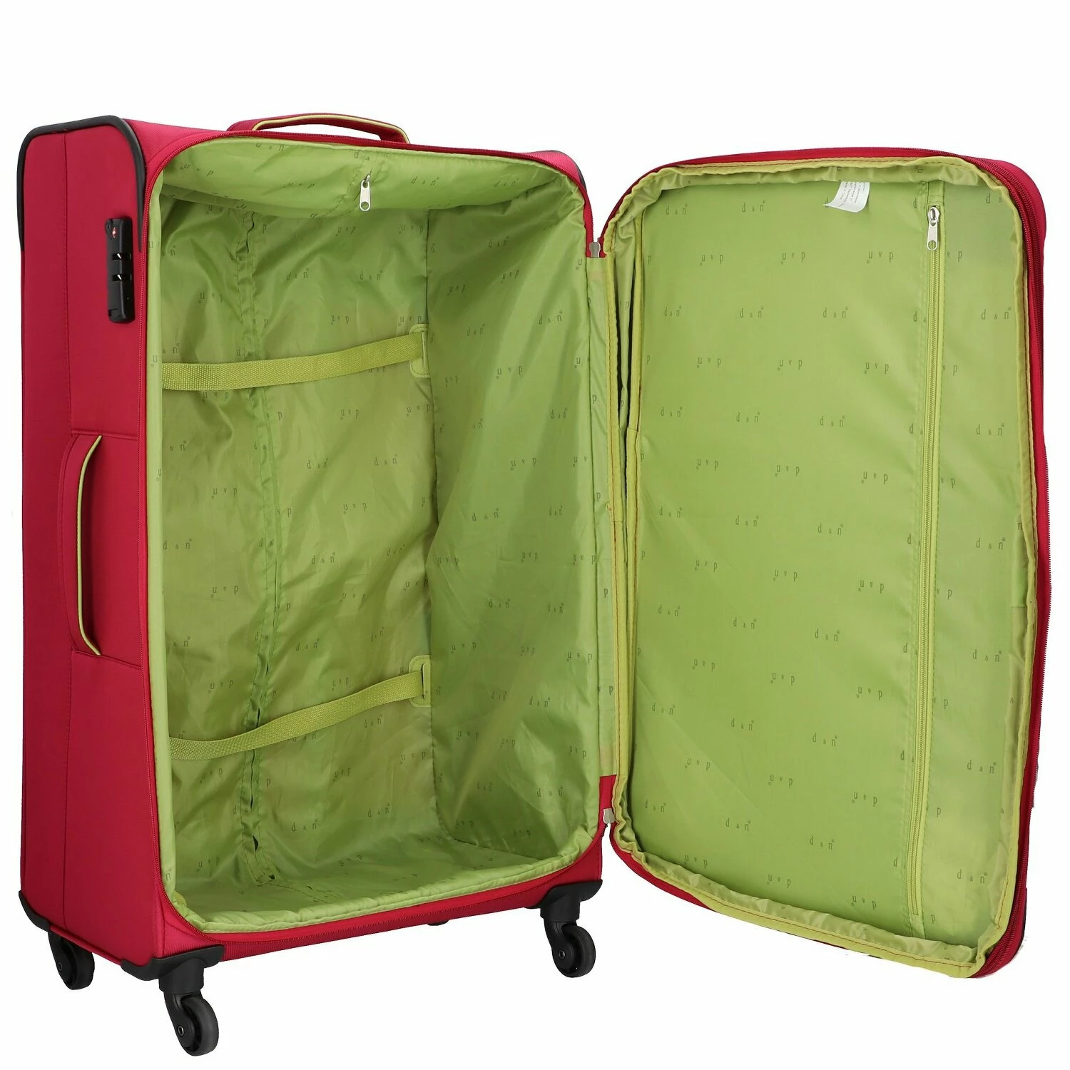 La línea Travel Line 6704 de d & n ofrece modernos trolleys fabricados en resistente nailon con interesantes colores de contraste. Las maletas son ligeras y flexibles para utilizarlas en cualquier viaje gracias a sus ruedas de marcha suave y a su asa extensible y bloqueable.