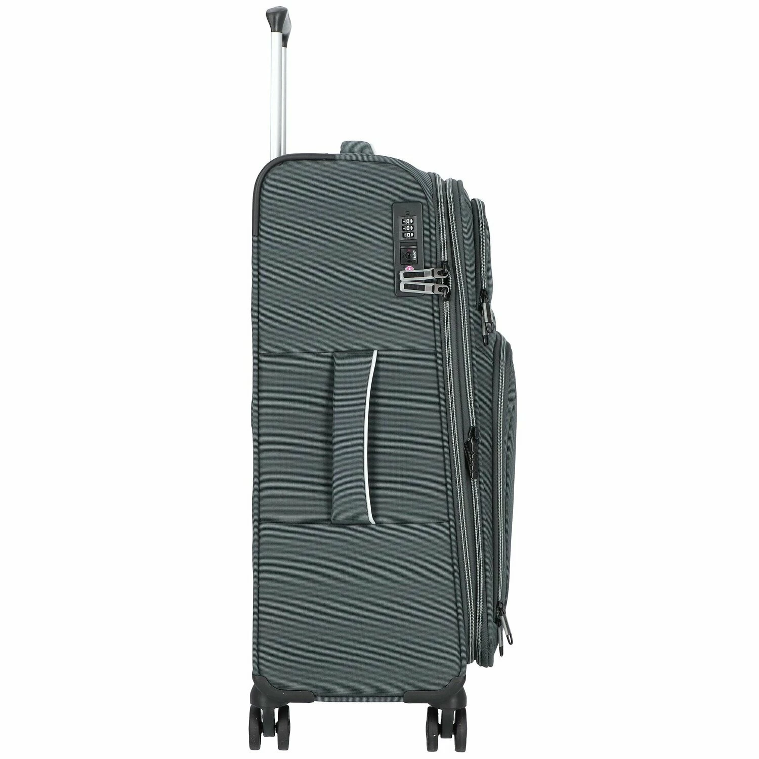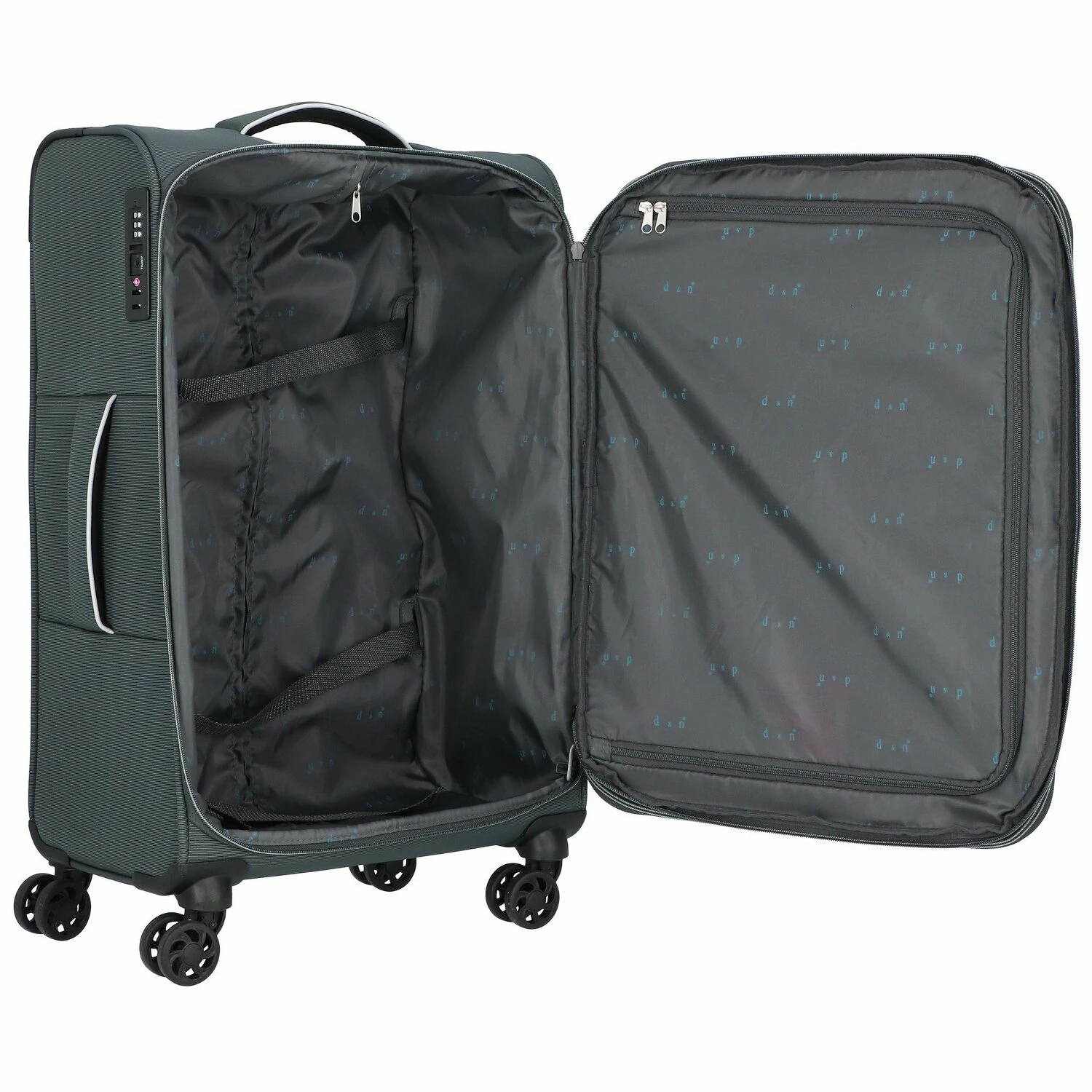 Trolley ligero de d & h de la línea Travel 9204 fabricado en poliéster resistente. El trolley tiene un espacioso compartimento principal con un compartimento para la ropa sucia y un bolsillo con cremallera, así como dos bolsillos delanteros, que ofrecen mucho espacio y una buena organización. El asa con cierre y las cuatro ruedas de marcha suave hacen de este trolley un fiel compañero de viaje. Equipado con cerradura TSA.