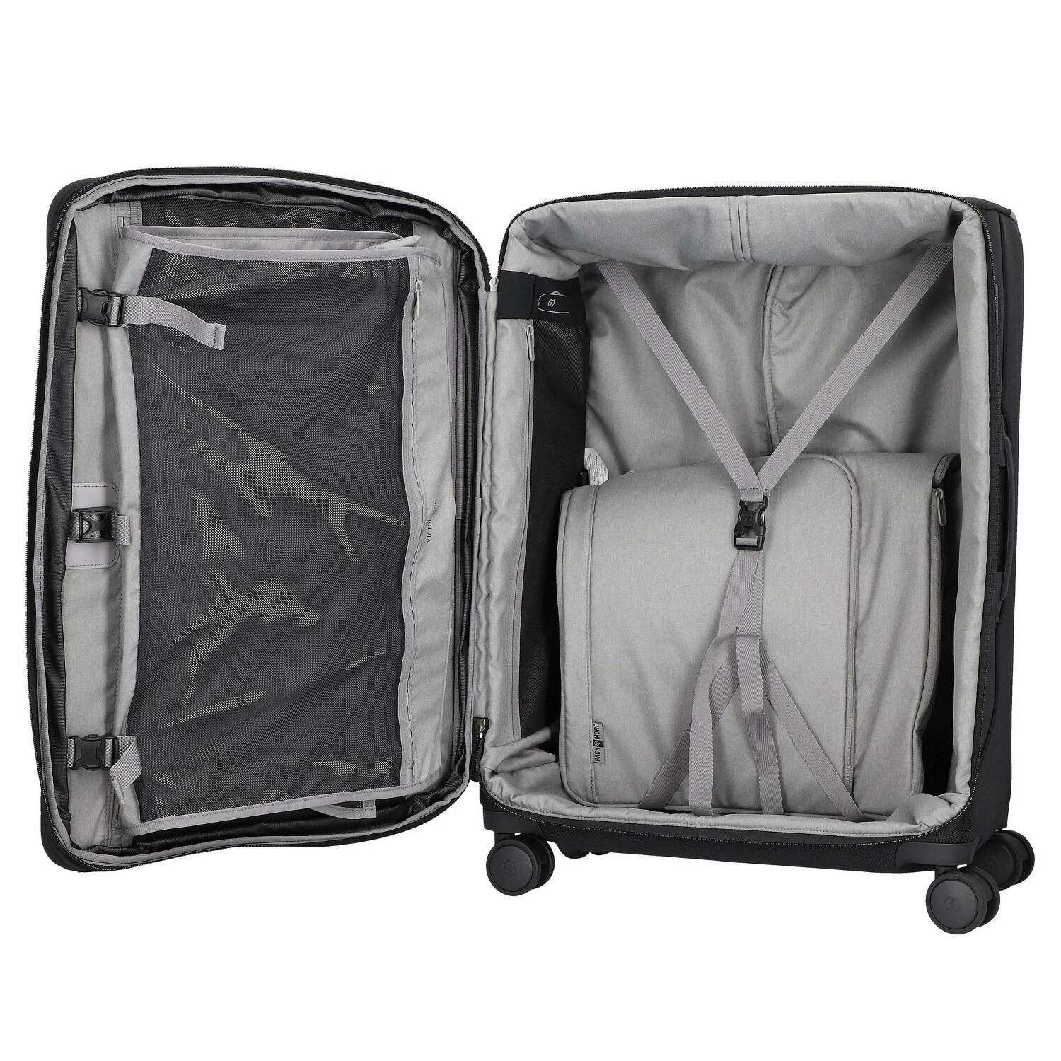 Trolley con 4 ruedas en nylon con cerradura homologada Travel Sentry ®. Un portatrajes extensible evita que la ropa se arrugue. El carro también es ligero y tiene correas para sujetar una bolsa.