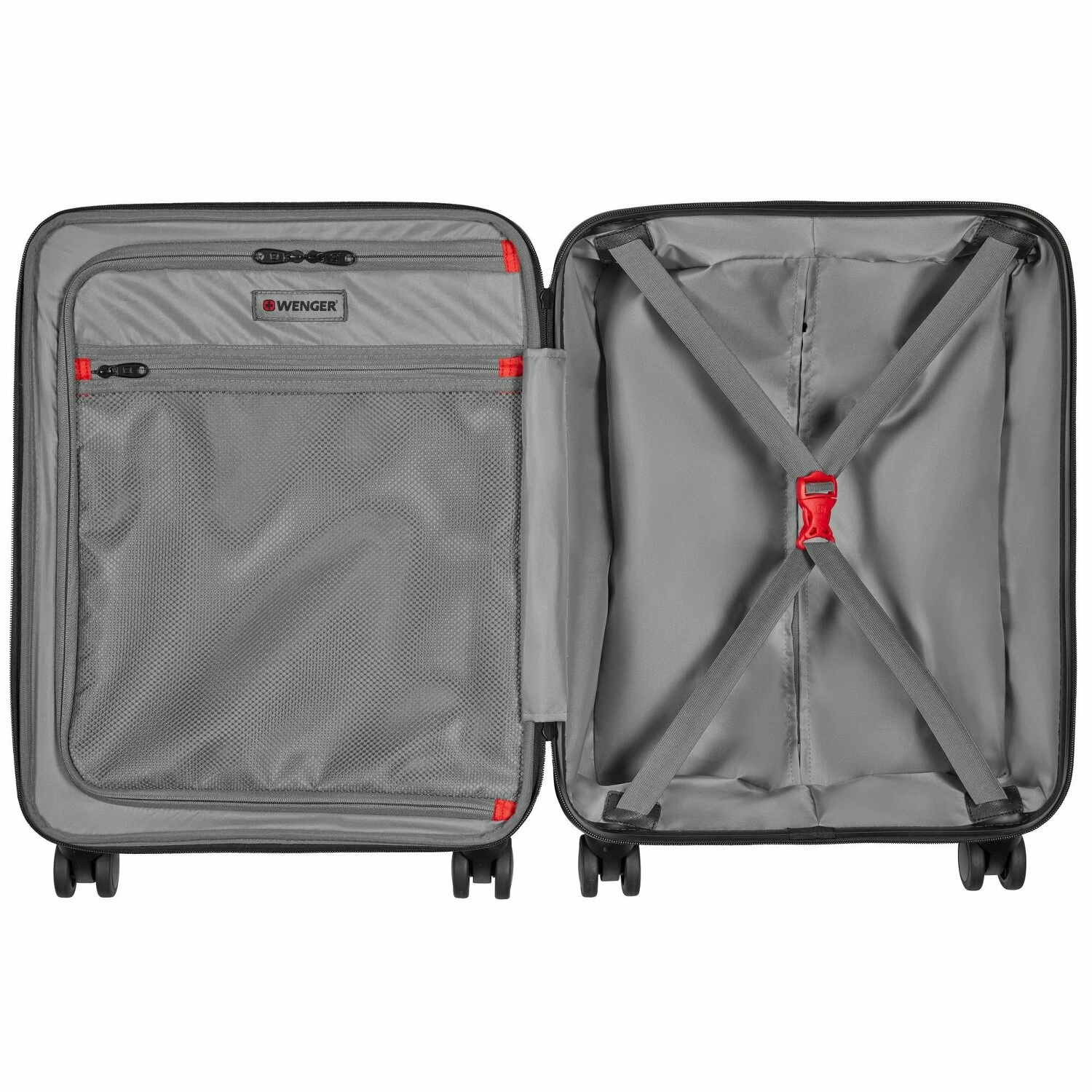 Funcional trolley de cabina de 4 ruedas de Wenger fabricado en resistente ABS o policarbonato con un diseño sencillo y moderno. En su interior hay un compartimento para la ropa sucia, así como compartimentos con cremallera y una correa cruzada para mantener todo en su sitio durante el viaje. El trolley de cabina está equipado con un asa de transporte y un asa con cerradura.